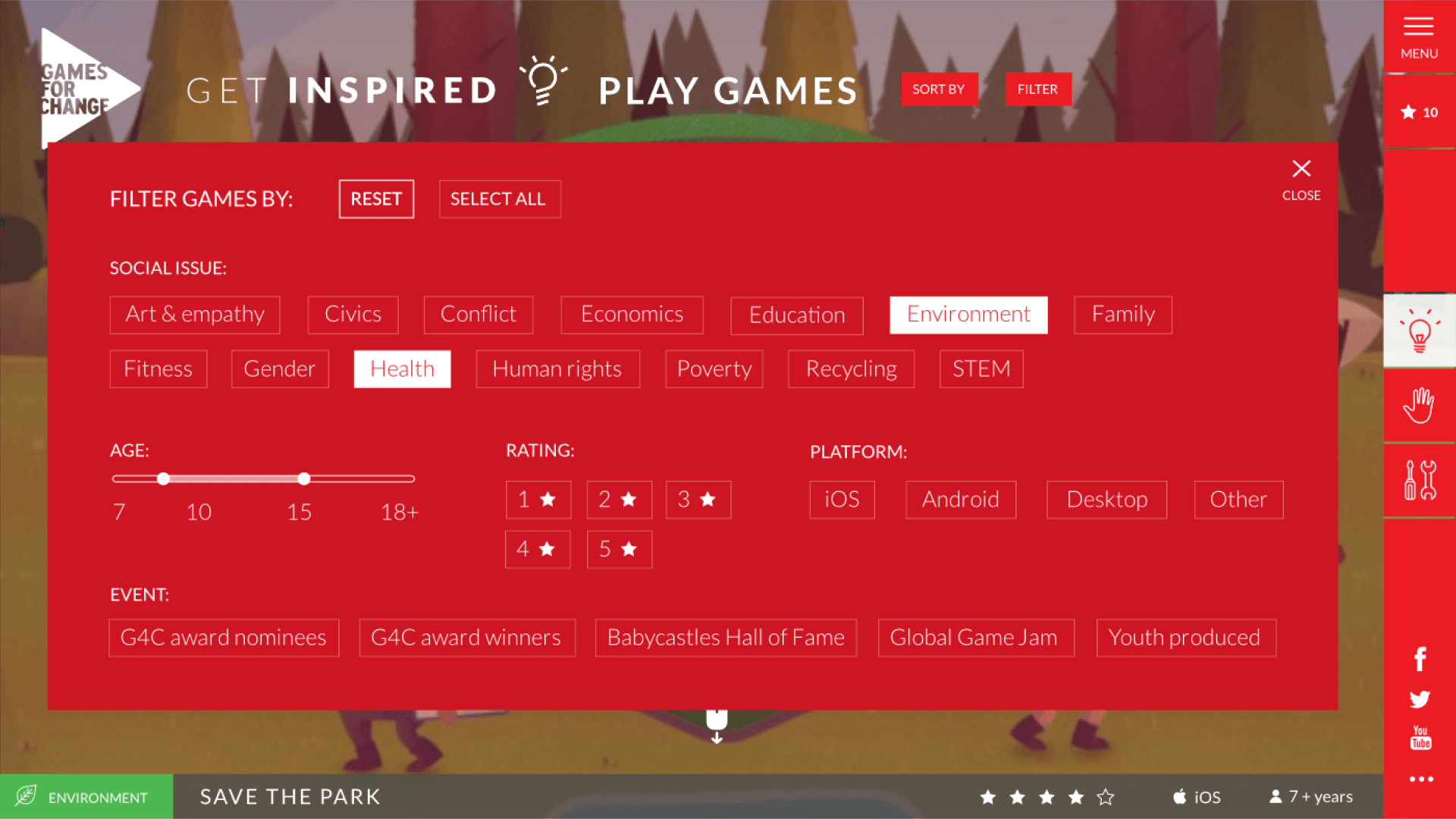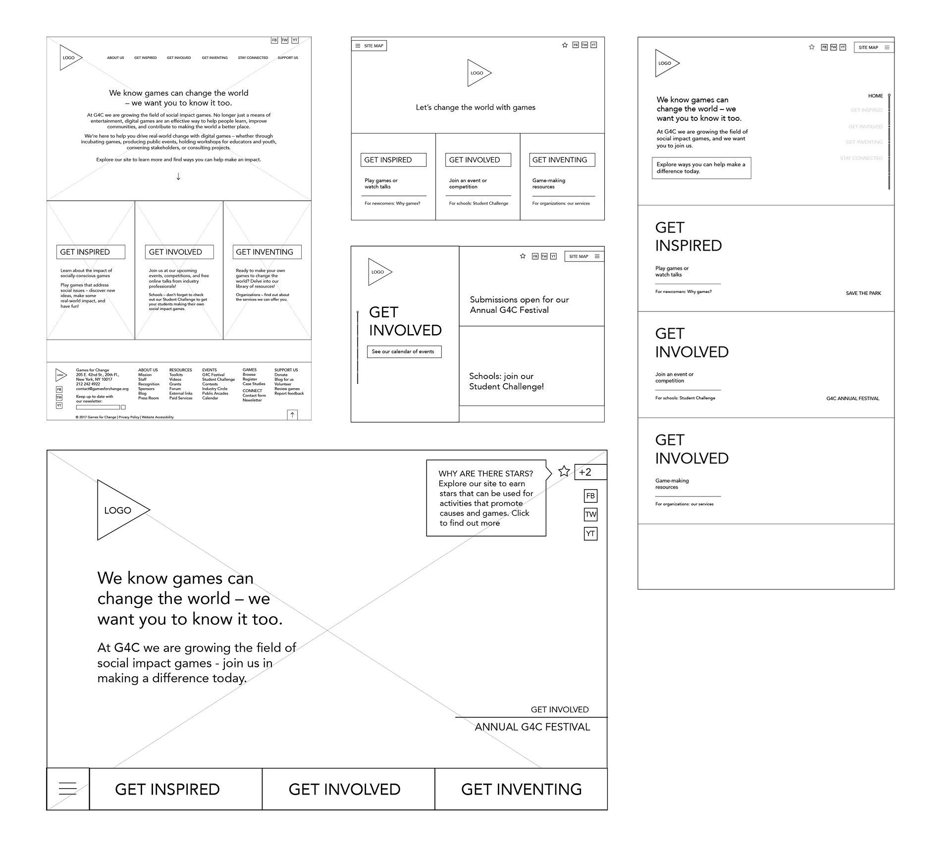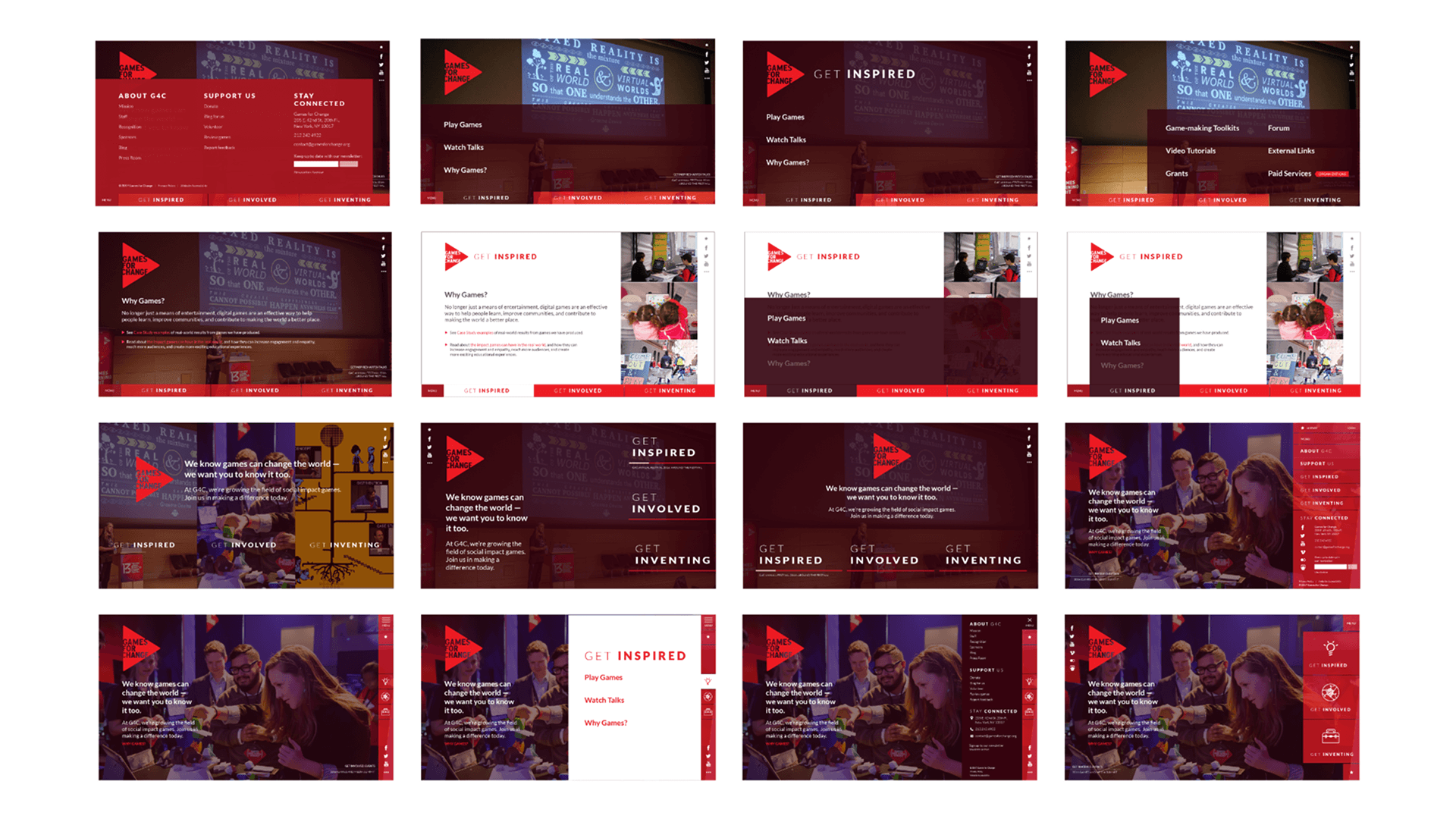 To better understand the organization, I audited their existing site, analyzed their social media to identify their priorities and audiences, and looked into current website trends. From there I consolidated and reorganized their content into a more intuitive structure, and introduced three user pathways to better match how their visitors engage with the organization. \n\n\nDrag\nFor the visual design my goal was to create a modern, full-width, responsive layout that felt as innovative as their mission, while utilizing the many community photos and videos they had available. To engage and inspire users, I also introduced a visual indicator on the games page to highlight games that had measurable real world impact.\n\n\nDrag\nLooking back now, with my additional design experience and accessibility knowledge, there are changes I would make to some of the designs, but I believe my research insights still apply, and could help improve G4C’s since-updated website.\n\n